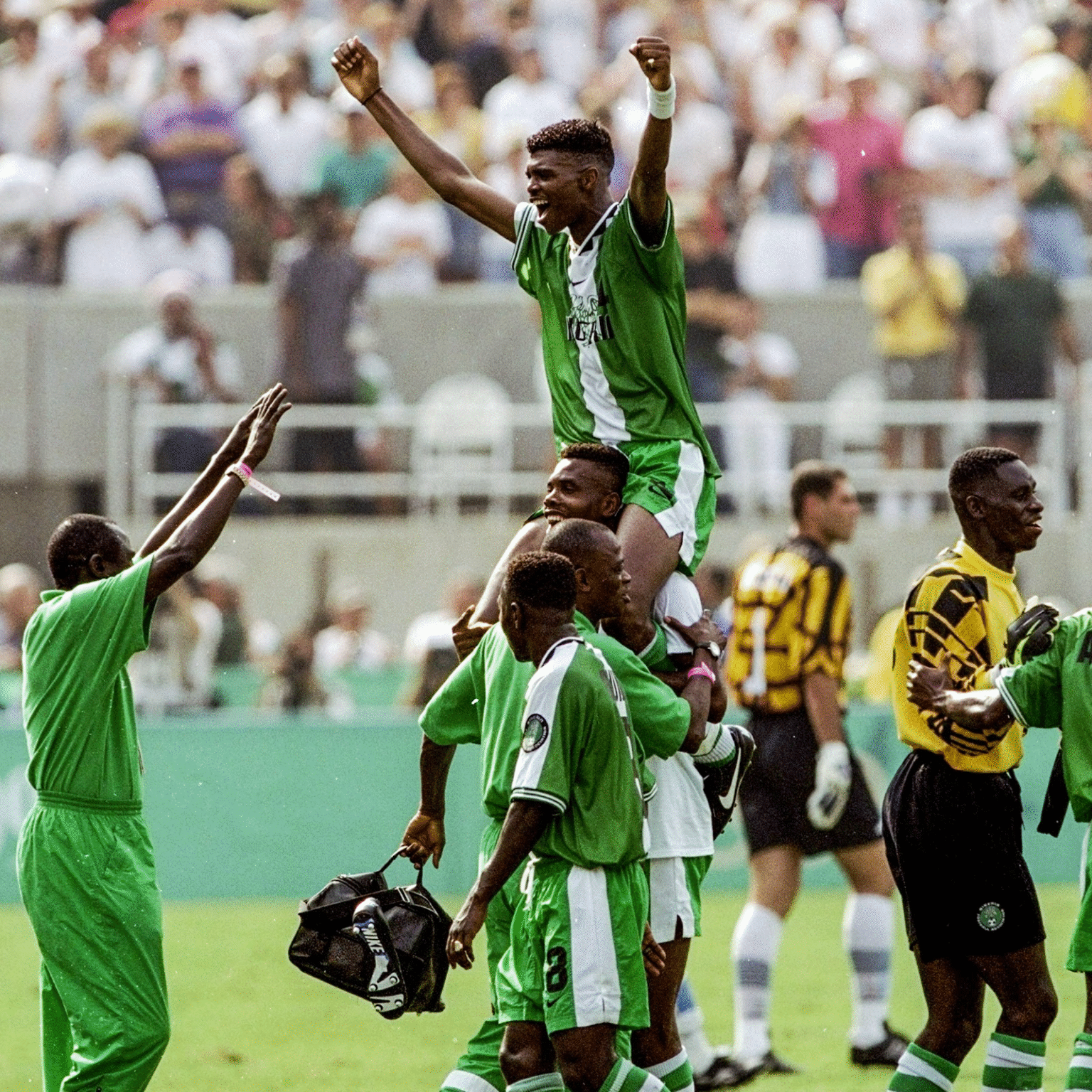 After Crespo restored Argentina’s lead from the penalty spot, substitute Amokachi leveled again. And then, in the 90th minute, Emmanuel Amuneke volleyed home from a Wilson Oruma free kick to seal a 3–2 victory.